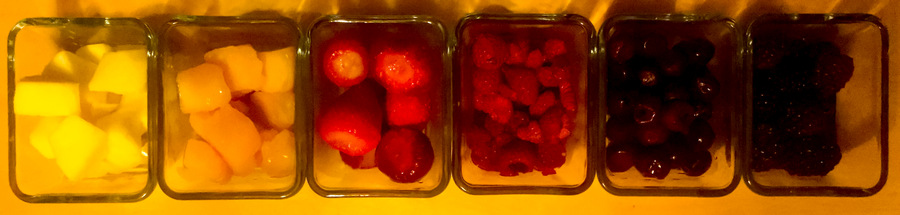 Einfache Brombeeren, mit ein bisschen Vanille gewürzt, mit den ganz normalen Streuseln - Sauerkirsch-Crumble mit Kakaostreuseln
