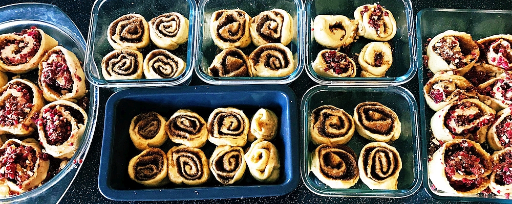 - Die einzelnen Rollen in geölte Backformen legen – so dass sie sich nicht berühren und bei Bedarf die Füllung, die beim Aufschneiden rausgefallen ist, drüberstreuen – und nochmal 90 Minuten gehen lassen (die Himbeerschnecken brauchen wegen der gefrorenen Beeren etwa doppelt so lange)